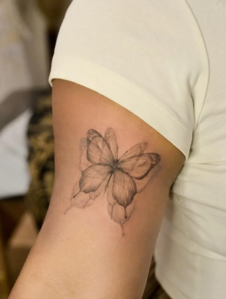 This tattoo presents a butterfly with beautifully shaded wings, creating a soft, almost watercolor-like effect.