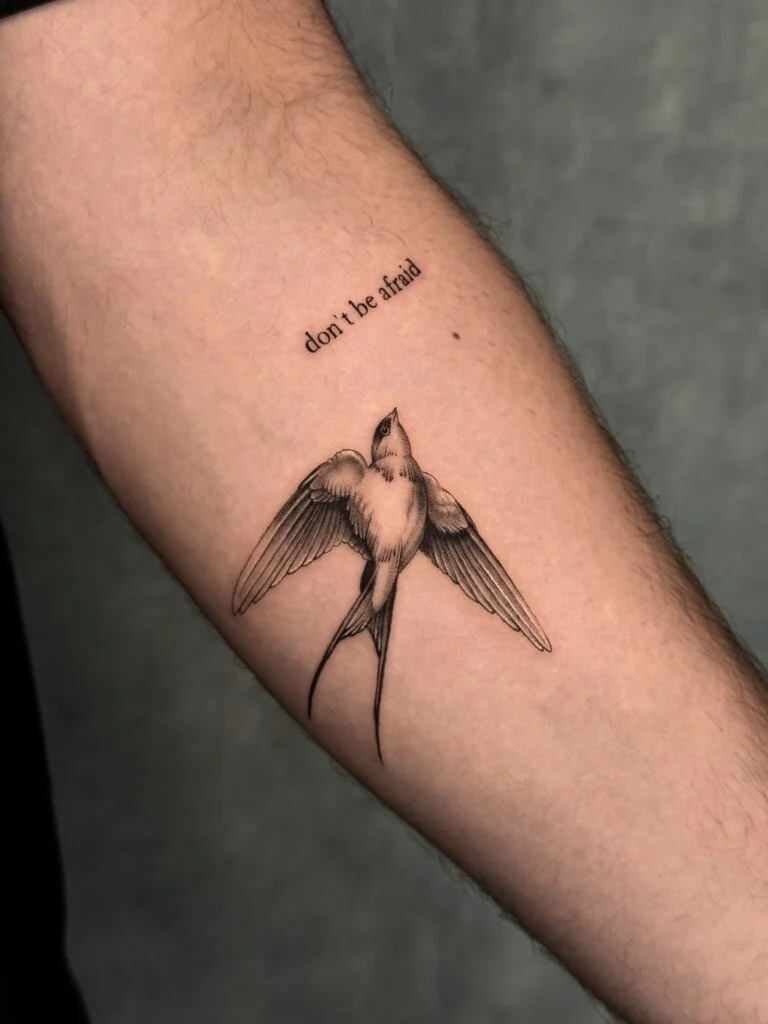 This fine line tattoo combines a graceful swallow in flight with a powerful phrase, “don’t be afraid.”