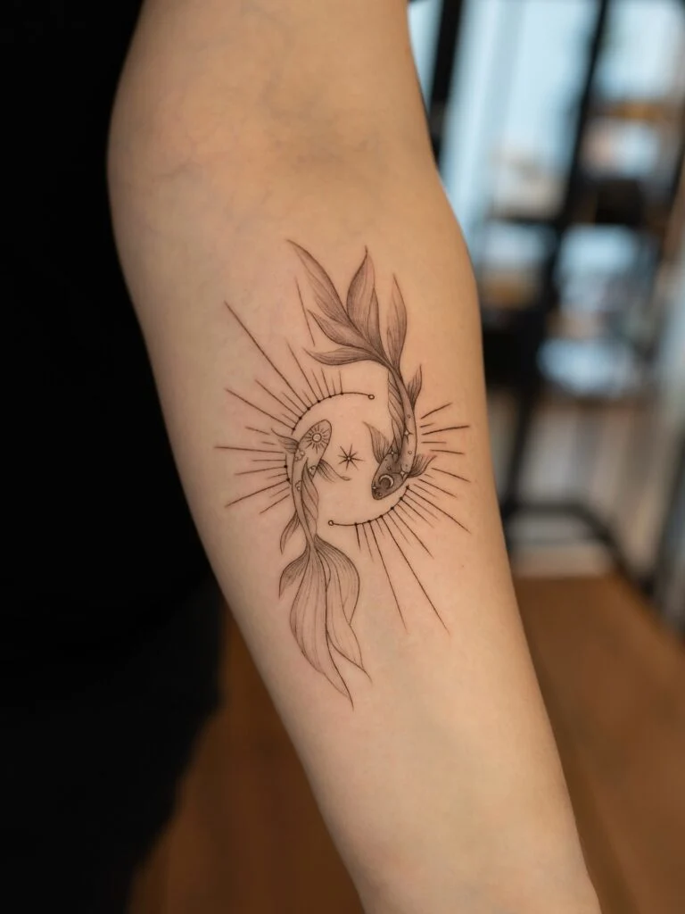 Their flowing tails are delicately shaded, creating a sense of graceful movement within the circular design. Radiating lines extend outward, giving the tattoo a glowing, almost celestial presence.