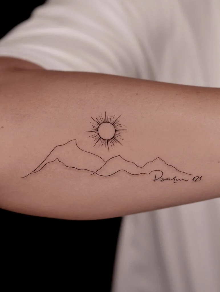 This fine line tattoo depicts a radiant sun rising above a simple mountain outline, paired with the inscription “Psalm 121.”