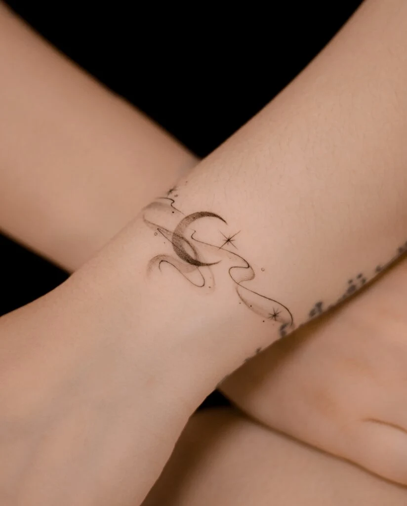 Placed around the wrist, it feels like a graceful bracelet made of the night sky. This design is perfect for those drawn to lunar symbolism and seeking a tattoo that blends elegance, spirituality, and the beauty of cosmic flow.