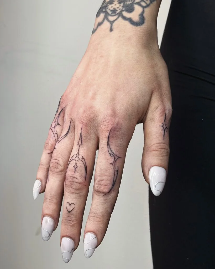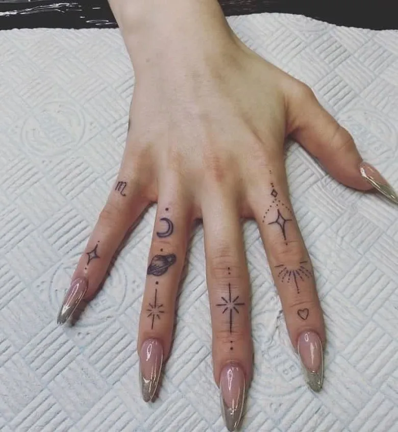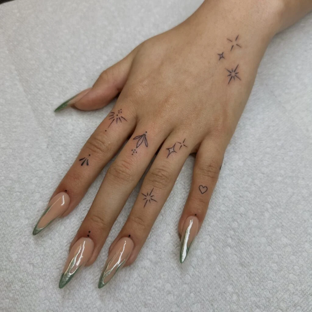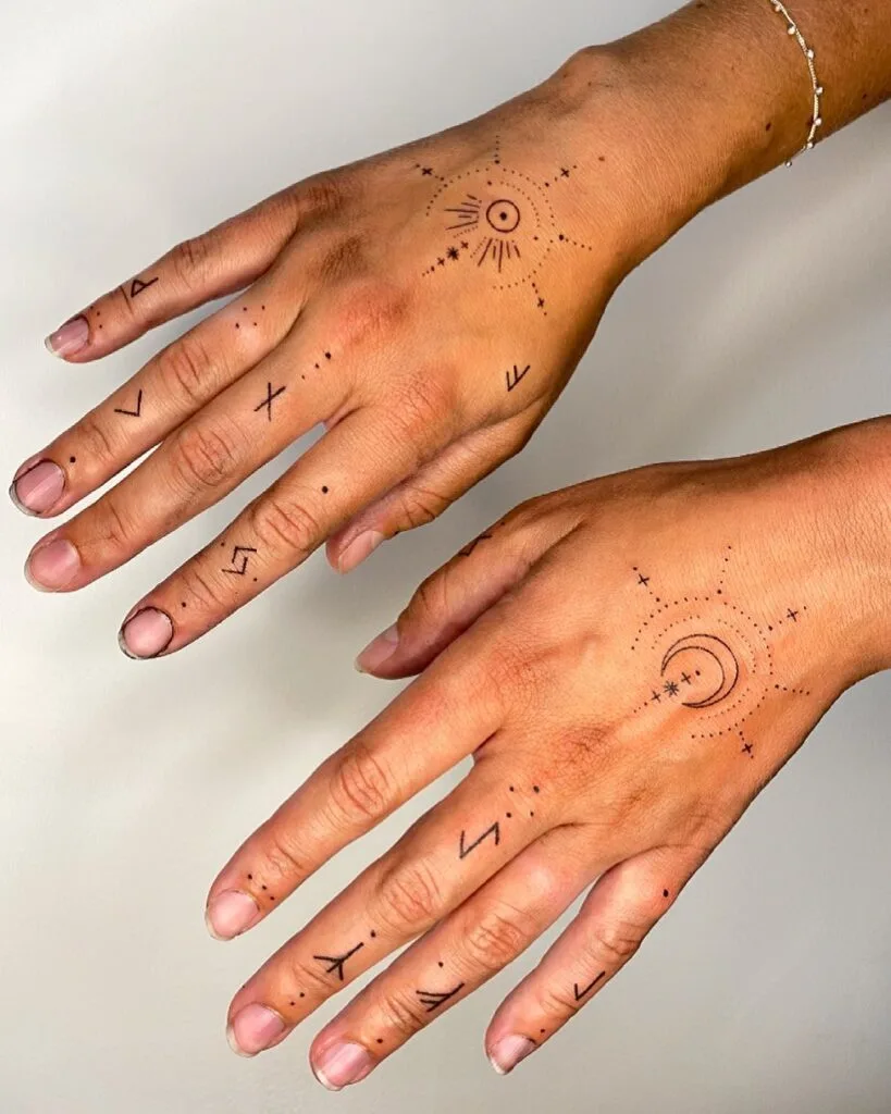 This striking set of finger tattoos mixes tiny dots, stars, arrows, and mandala-like symbols across both hands.