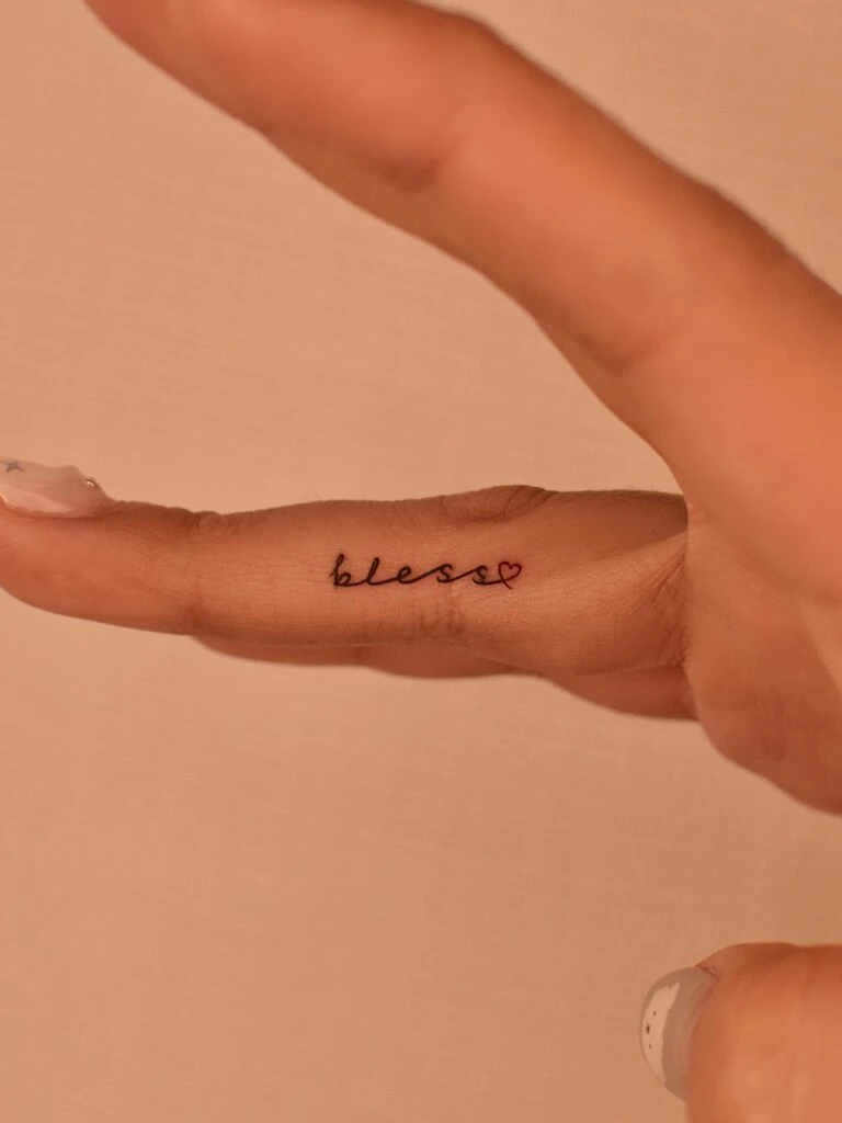 This delicate tattoo spells out the word “bless” in soft, flowing black script along the side of the finger.