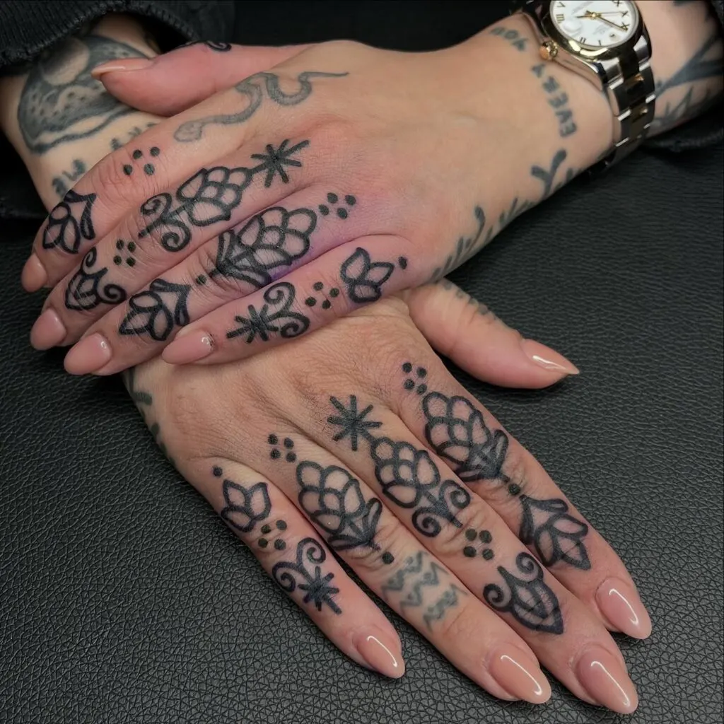 These finger tattoos are perfect for those who love standout hand art, these tattoos combine floral elegance with bold, graphic energy that feels both traditional and contemporary.