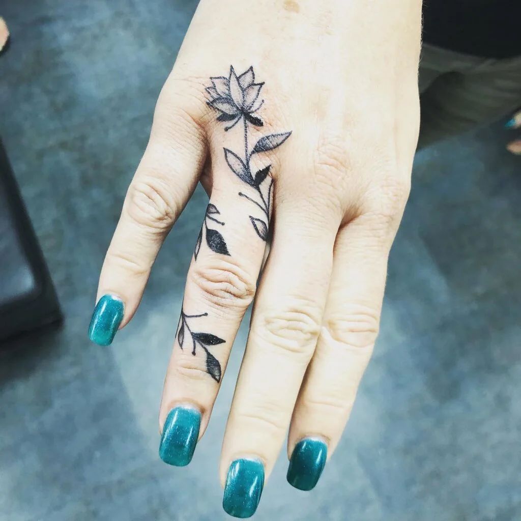 This striking finger tattoo features a bold lotus flower that extends gracefully into a trailing vine of leaves.