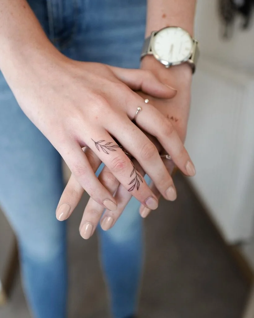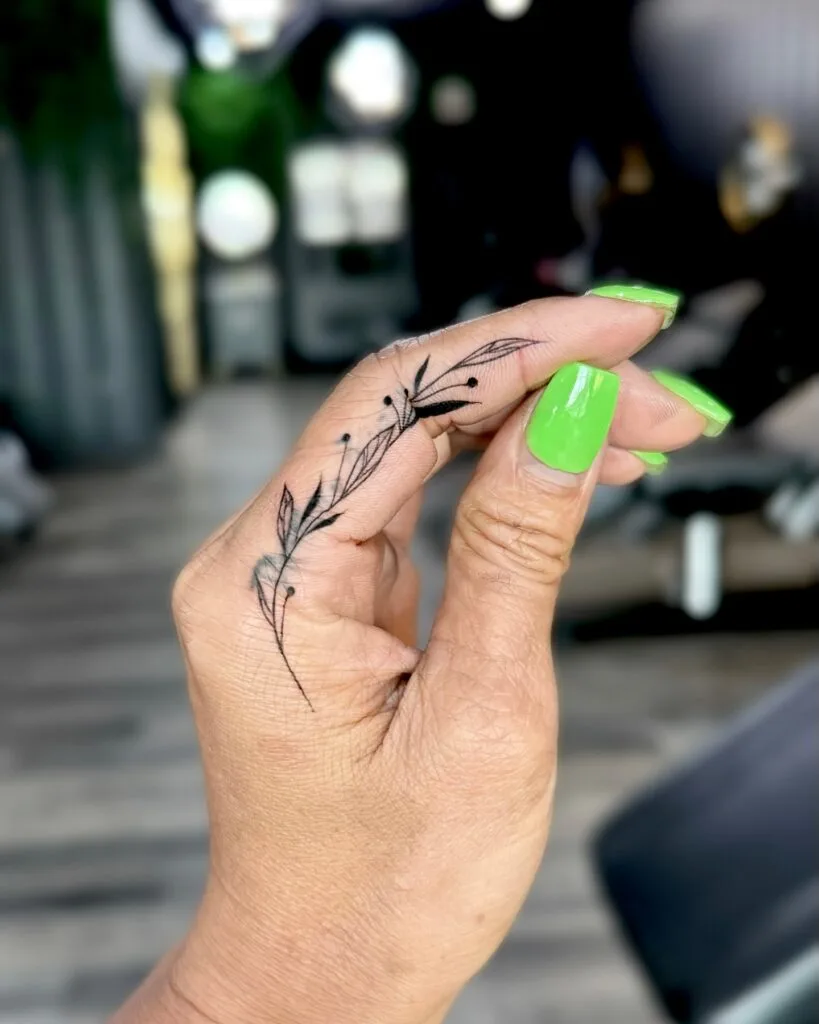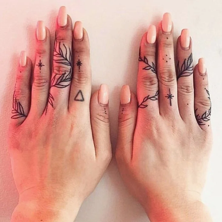 This elegant finger tattoo design blends nature and starlight with soft precision. Slim leafy branches wrap gently along the fingers, creating natural movement.
