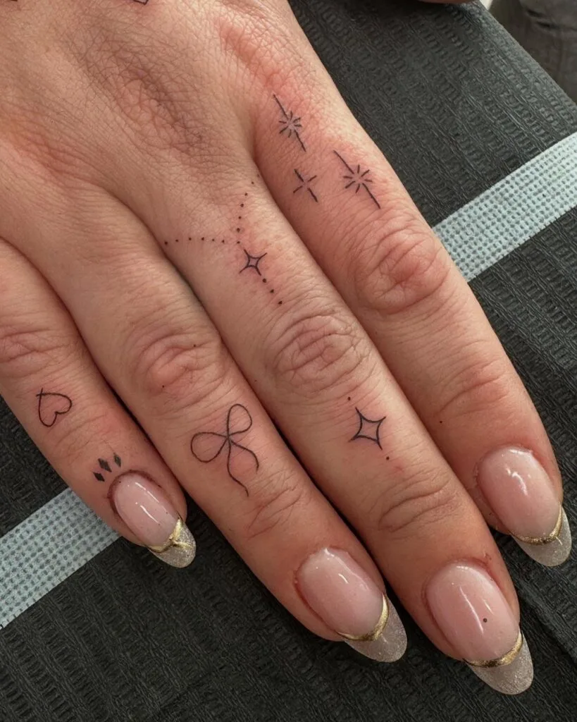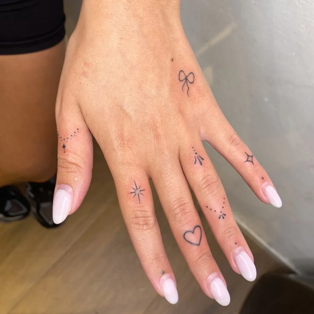 This playful finger tattoo set mixes soft shapes with subtle starry details for a balanced, pretty look. A tiny bow sits on the hand, adding a sweet, feminine accent.