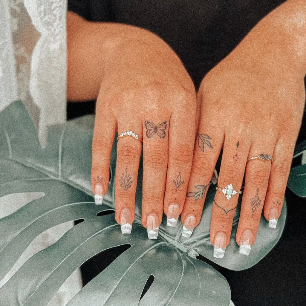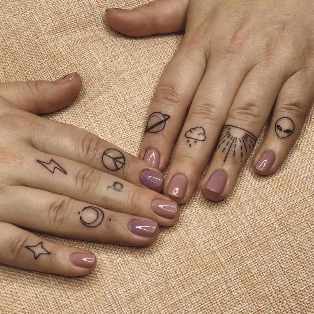 Placed thoughtfully around the fingers, these minimal tattoos feel refined and modern. They suit someone seeking understated art that remains stylish and personal, offering a delicate yet noticeable accent to everyday fashion and special moments alike.