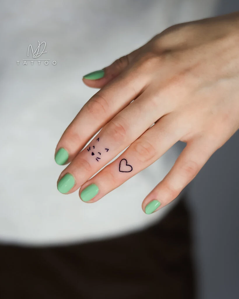 This playful finger tattoo features a simple cat face and an outlined heart, creating a fun, charming design.