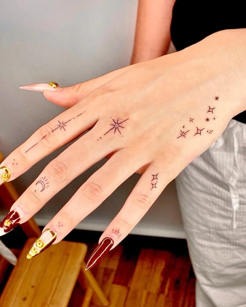 This finger tattoo set captures a dreamy night-sky vibe with tiny stars, moons, and sparkling bursts.