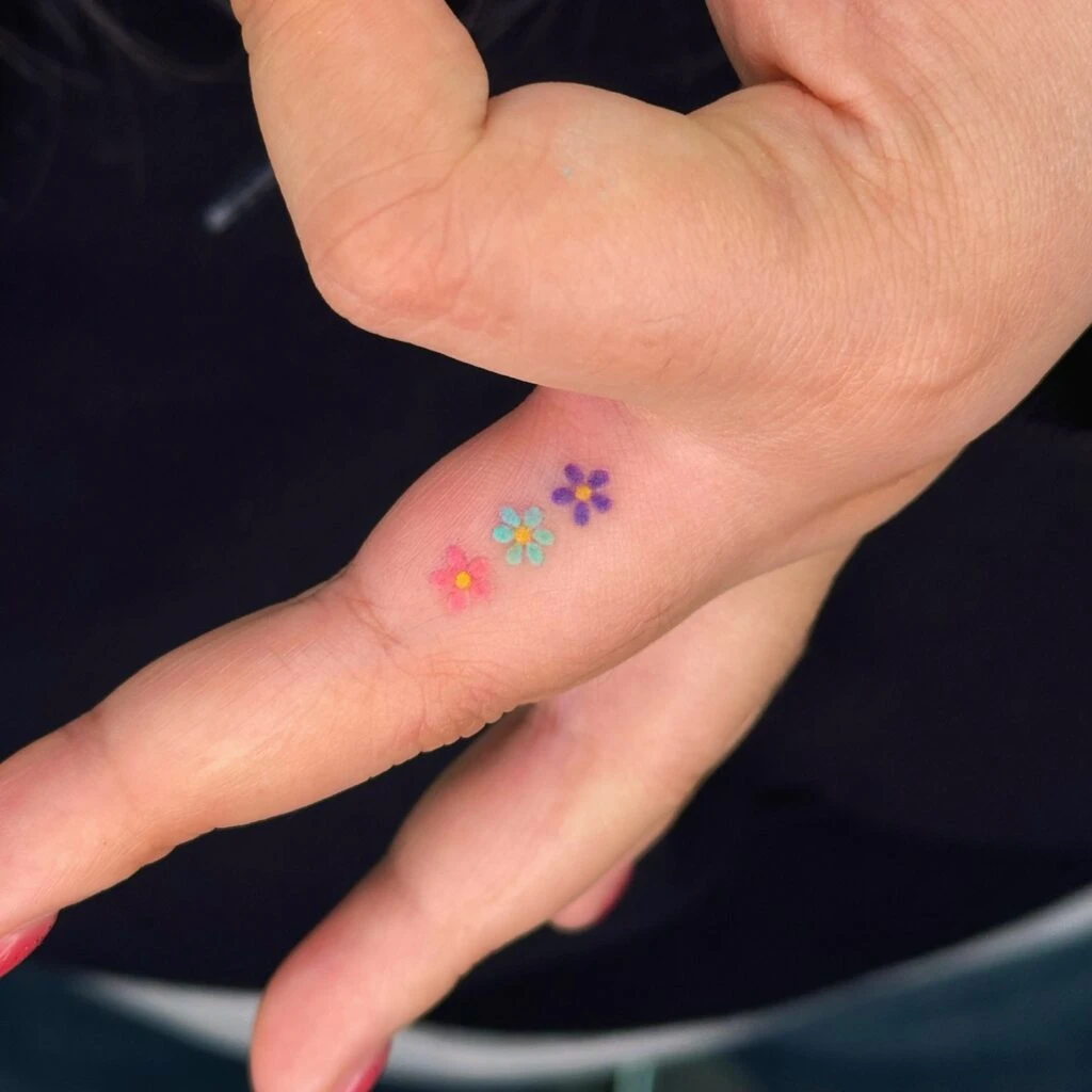 This charming finger tattoo features three tiny flowers in bright pink, teal, and purple. Each flower has neat, soft petals that create a cheerful, playful effect.