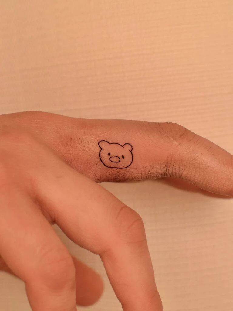 This charming tattoo features a simple bear face outlined with clean black lines on the side of the finger.