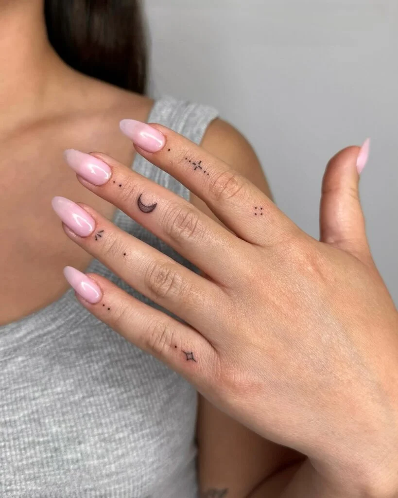 This charming finger tattoo design mixes playful and elegant elements. Tiny stars and dotted trails create a soft, night-sky feeling.