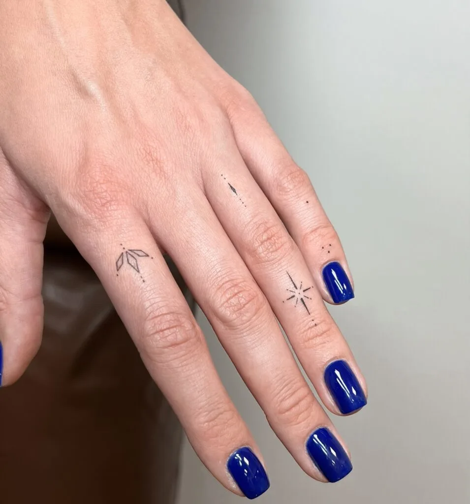 This modern finger tattoo design combines sharp geometric lines with soft, minimal star details. A stylized leaf made of angular shapes decorates one finger, giving it a bold yet clean look.