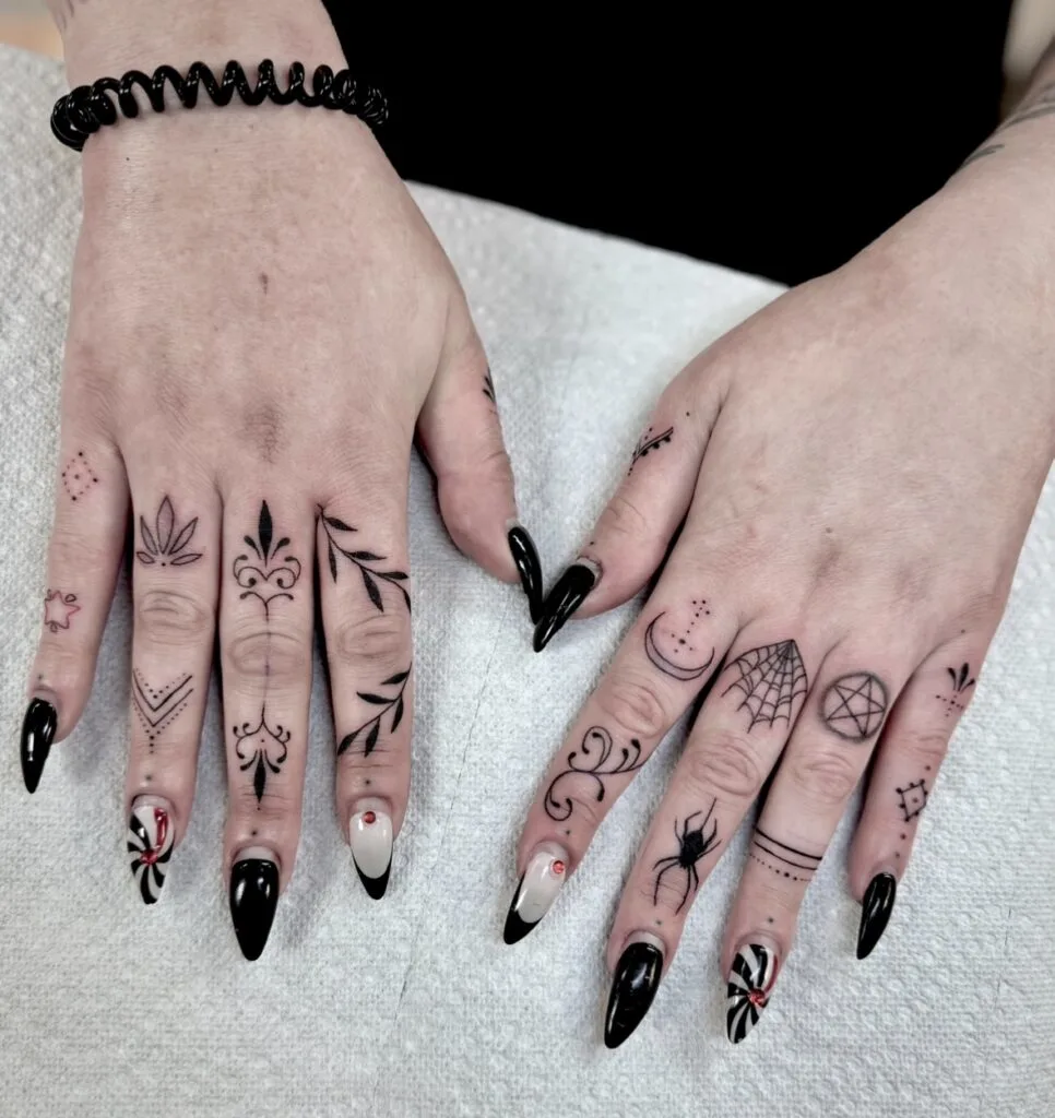 This striking finger tattoo collection combines gothic motifs with natural accents for a bold, creative style. Delicate leaves run along several fingers, adding soft organic movement.