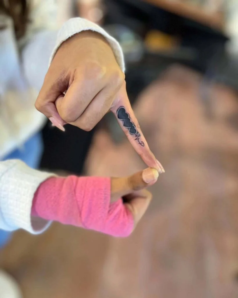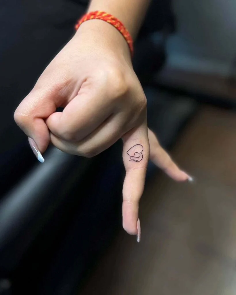 The combination feels creative and intentional, making these tattoos perfect for someone wanting unique finger art that shares love and personality with subtle elegance.