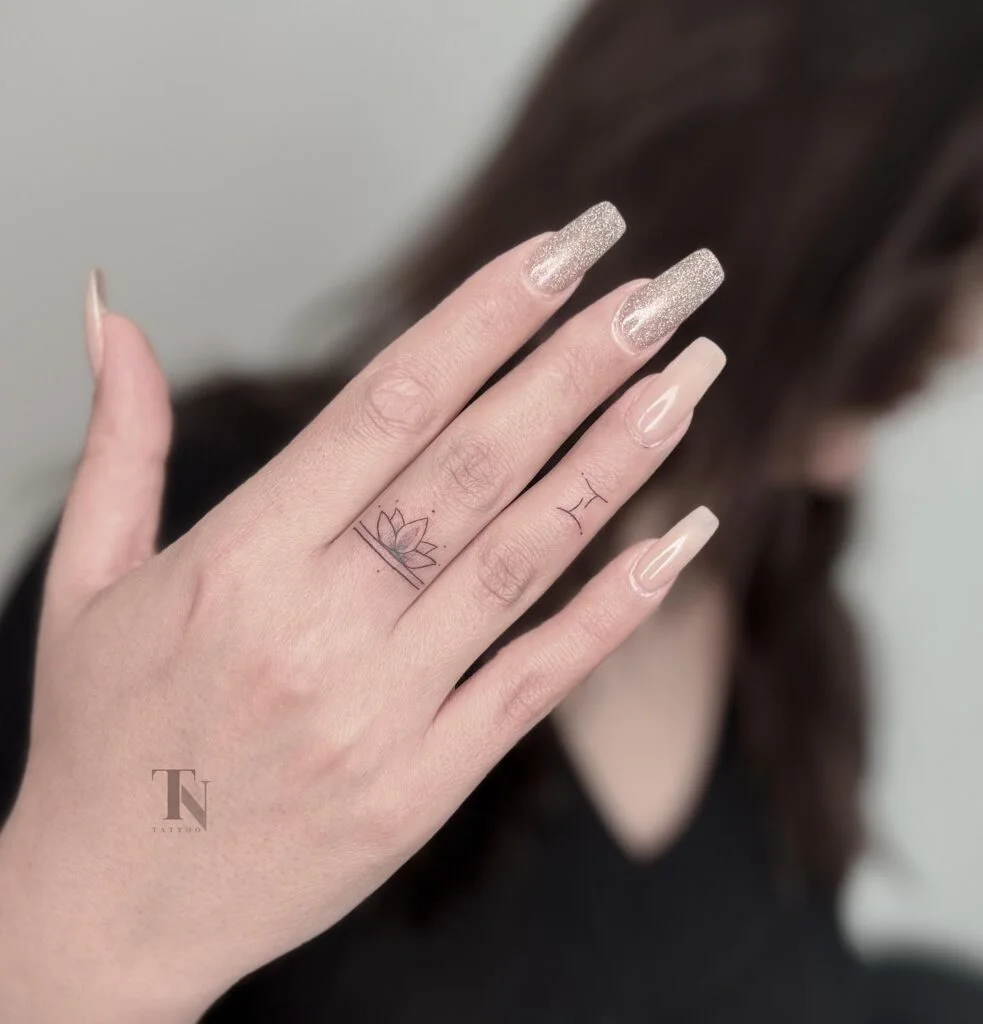 This delicate finger tattoo pairs a detailed lotus outline with a minimalist Gemini zodiac sign on adjacent fingers.