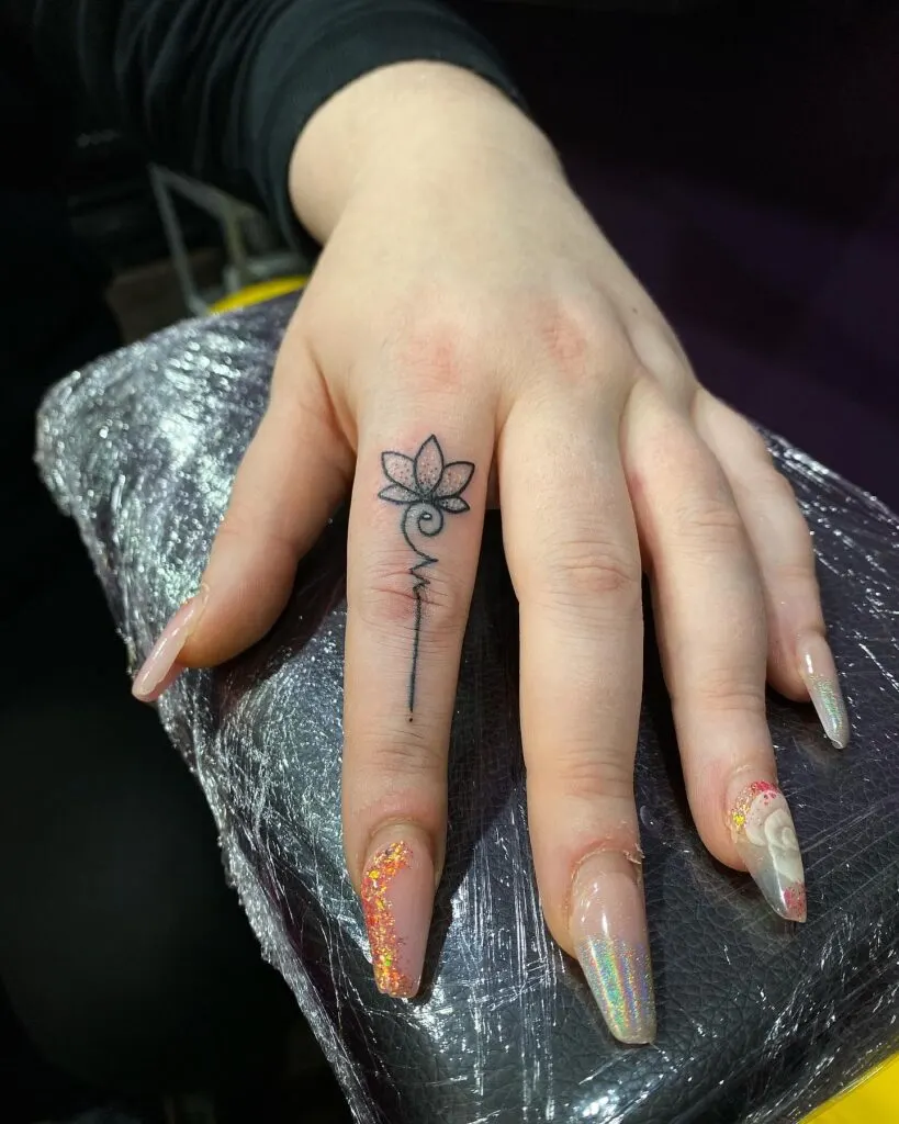 This elegant finger tattoo displays a lotus flower with a long, winding stem that flows down the finger.