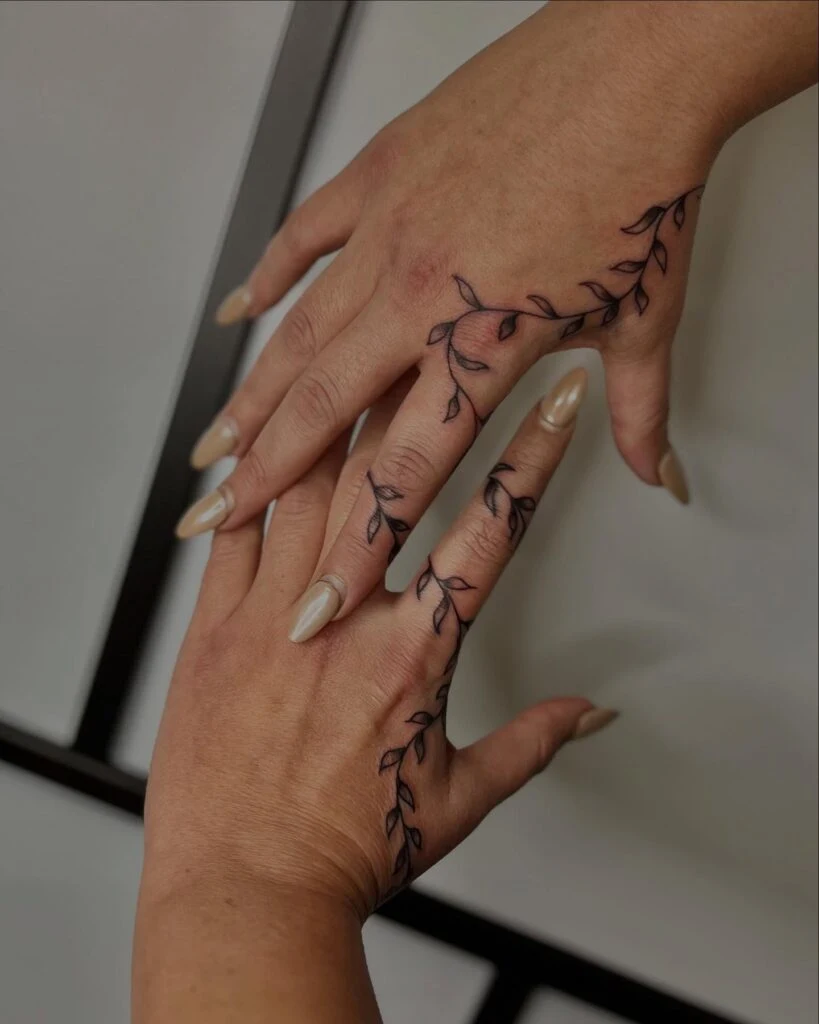 This beautiful design features matching leaf vine tattoos that wrap smoothly around the fingers and hands.