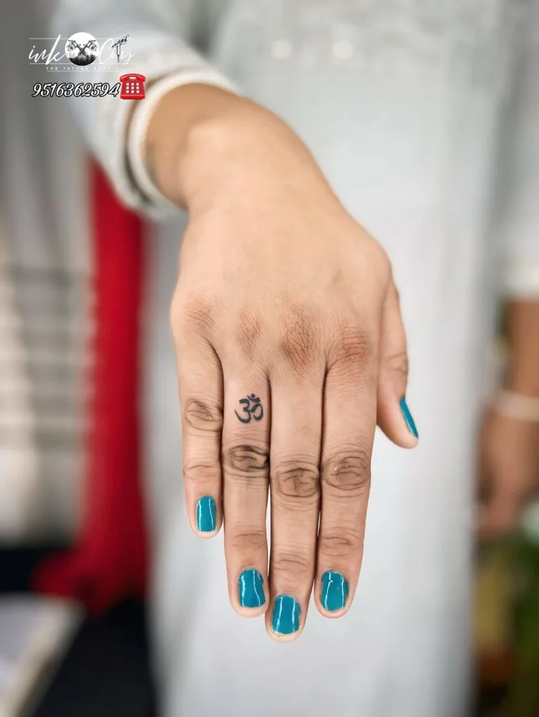 This spiritual finger tattoo highlights the sacred Om symbol in bold black ink. Its centered placement on the finger draws attention while staying minimal and clean.