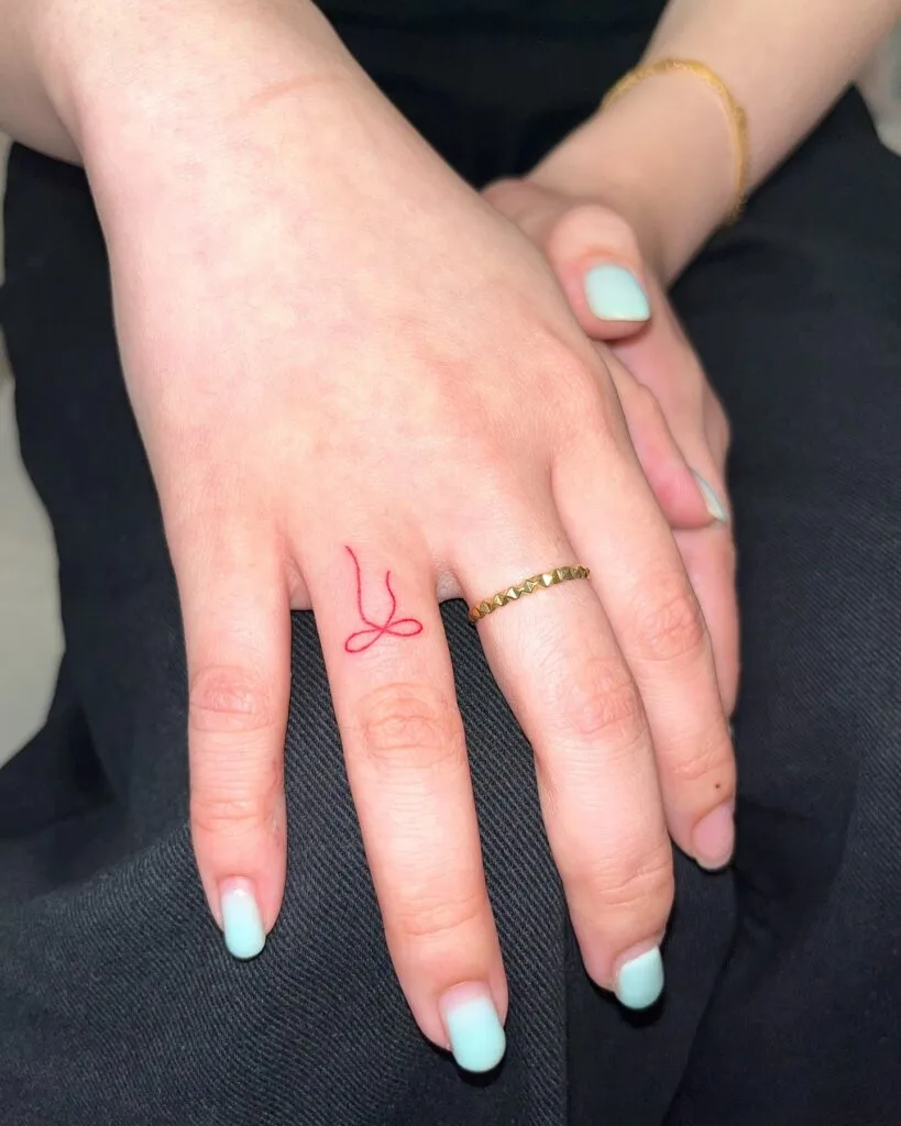 This delicate finger tattoo showcases a tiny bow drawn with fine red ink. Its clean lines and bright color create a soft yet eye-catching accent.