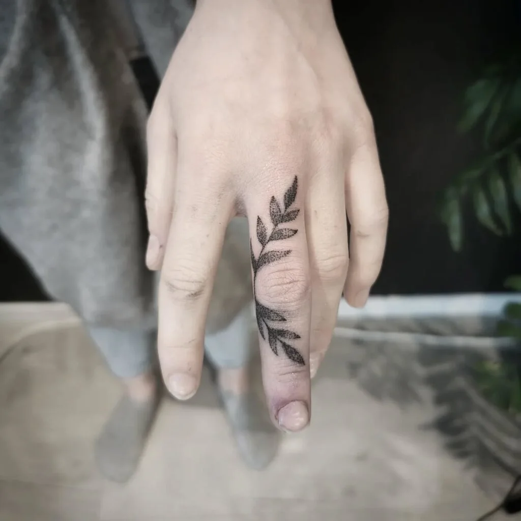 The leaves create natural movement, while the rich black fill adds depth and texture. Its placement makes it resemble a permanent ring, offering a nature-inspired alternative to jewelry.