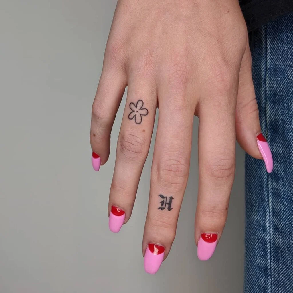 This clean finger tattoo design pairs a bold outline flower with a single gothic-style letter H. The five-petal flower sits neatly on the ring finger, giving a playful and minimal touch.