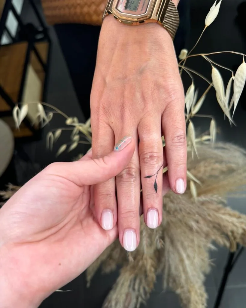 This delicate finger tattoo features a small green leafy branch placed gracefully on the side of the ring finger.