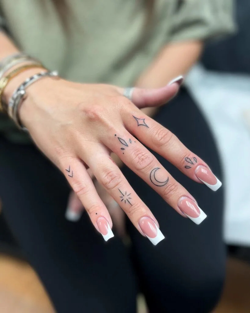 This graceful finger tattoo arrangement combines celestial and botanical elements for a soft, balanced look.