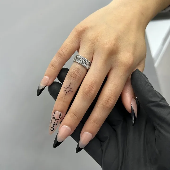 Clean black lines keep the look modern and refined. This design works beautifully with long manicures or delicate rings, offering a subtle yet striking way to carry cosmic inspiration on your hands every day.