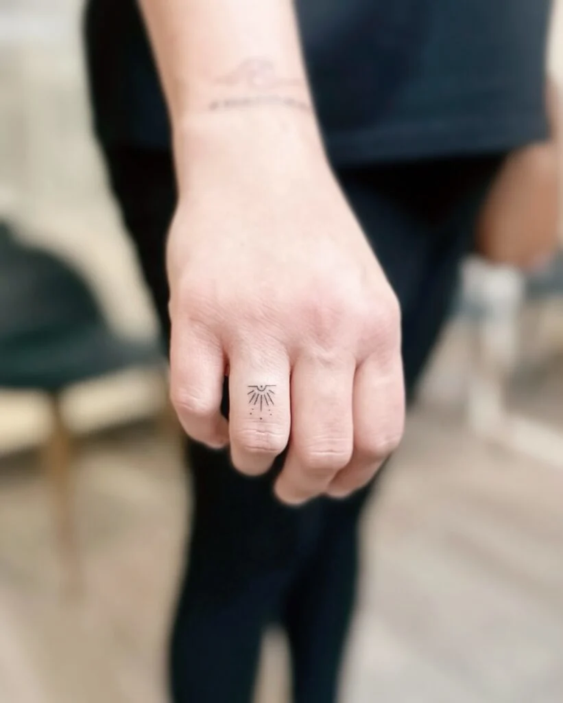 This minimal finger tattoo shows a small rising sun with thin rays spreading evenly across the skin.