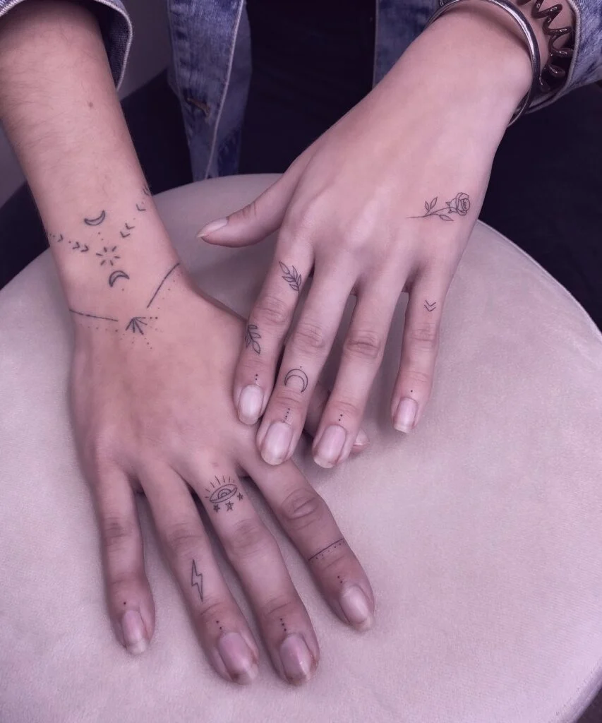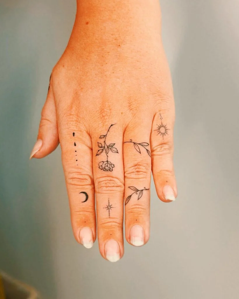 This graceful finger tattoo arrangement combines celestial and botanical elements for a soft, balanced look.