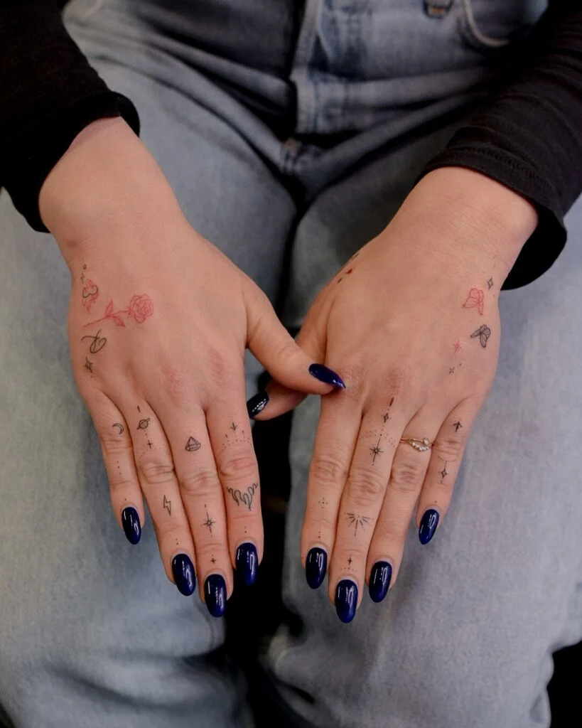 This striking set of finger tattoos mixes tiny dots, stars, arrows, and mandala-like symbols across both hands.