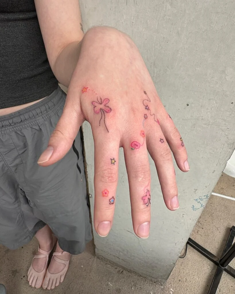 This playful finger tattoo design uses bright colors to create a cheerful, lively look. Pink clovers, tiny stars, and soft clouds scatter across the fingers with gentle precision.