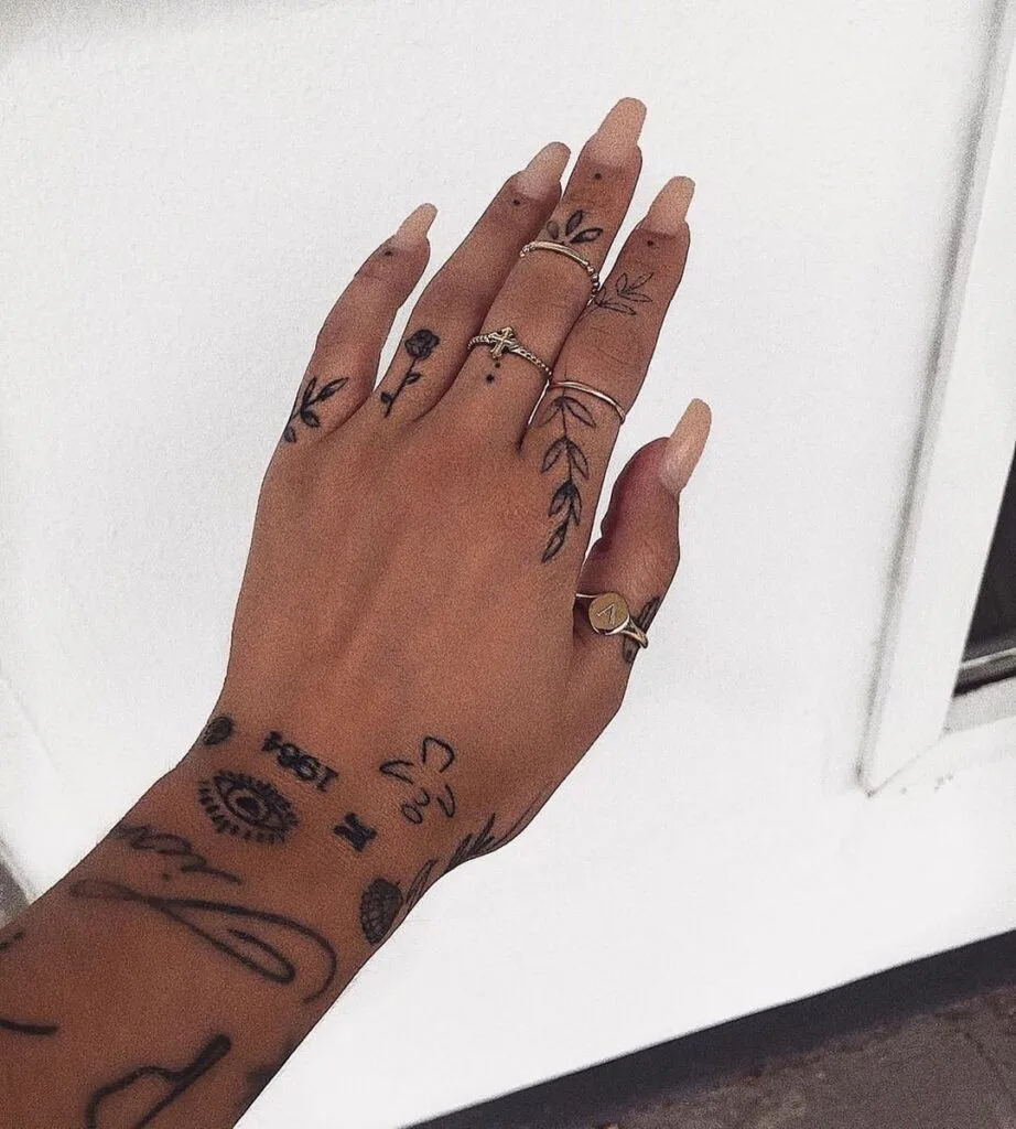 Paired with stacked rings, these tattoos create a stylish layered effect. Each detail stands alone but connects visually, offering a confident way to showcase art and meaning on the hand and fingers.