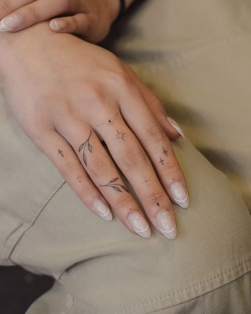 This elegant finger tattoo design blends nature and starlight with soft precision. Slim leafy branches wrap gently along the fingers, creating natural movement.