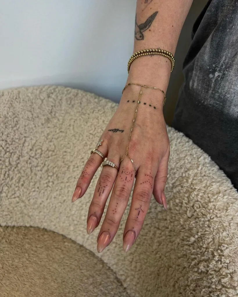 This minimalist design features fine dotwork that runs elegantly along the fingers and hand. Tiny dots and short vertical lines form geometric patterns, creating a refined, balanced style.