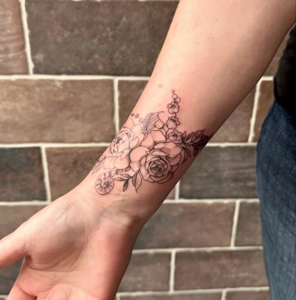 The light shading adds depth without overwhelming the natural elegance of the design. Positioned as a band, it subtly blends into the wrist, making it a perfect choice for someone who loves understated yet meaningful floral ink.