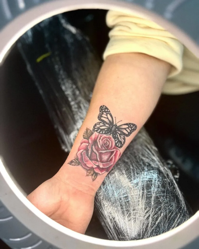 This tattoo features a beautifully shaded butterfly resting gently atop a pink rose, placed elegantly on the wrist. The rose is rich with depth and color, symbolizing love, strength, and beauty, while the butterfly adds a sense of transformation and freedom.