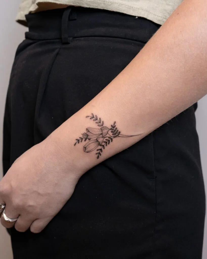 The upward flow of the stems complements the natural curve of the wrist, creating a graceful and balanced appearance. This tattoo symbolizes simplicity, natural beauty, and quiet resilience. It’s a perfect choice for someone who appreciates nature’s elegance and wants a subtle, timeless floral design.