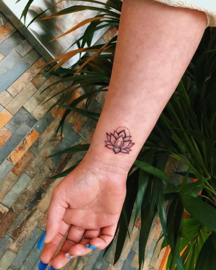 Clean lines and minimal shading keep the artwork elegant and serene. Placed on the wrist, this tattoo not only enhances visibility but also serves as a daily reminder of growth, resilience, and mindfulness. It’s a simple yet deeply meaningful floral design for any spiritual soul.