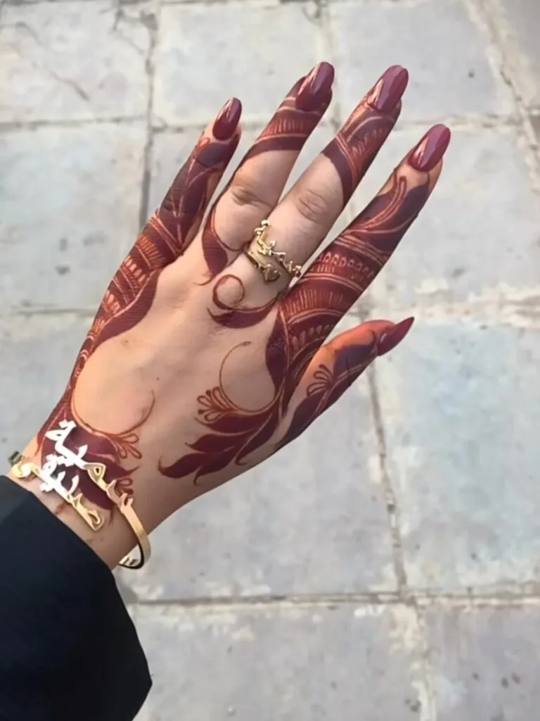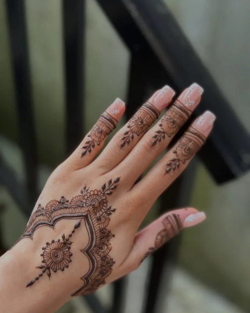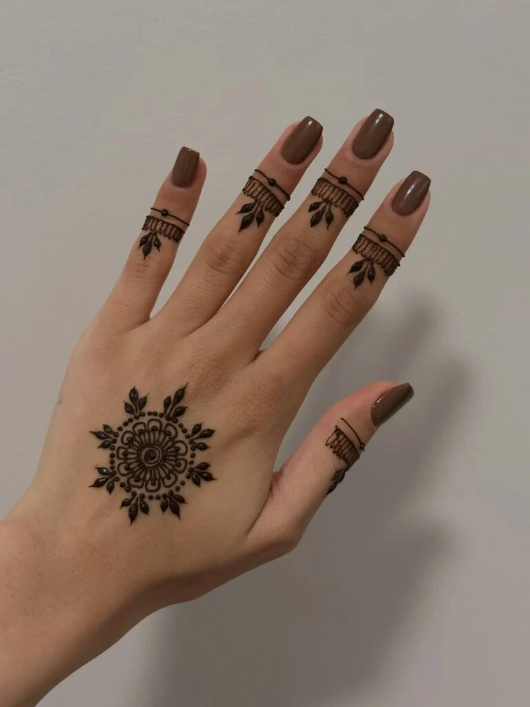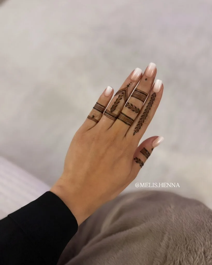 The understated beauty allows the natural shape of the fingers to stand out while adding a touch of elegance. Perfect for those who prefer modern, subtle henna, this style delivers chic refinement without overwhelming detail or complexity.