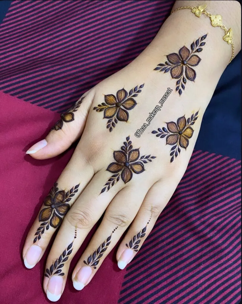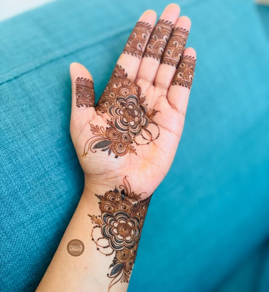 The wrists include delicate floral clusters that complete the layout gracefully. Perfect for casual gatherings or festive looks, this style combines simplicity with creativity, offering a modern yet traditional henna option.