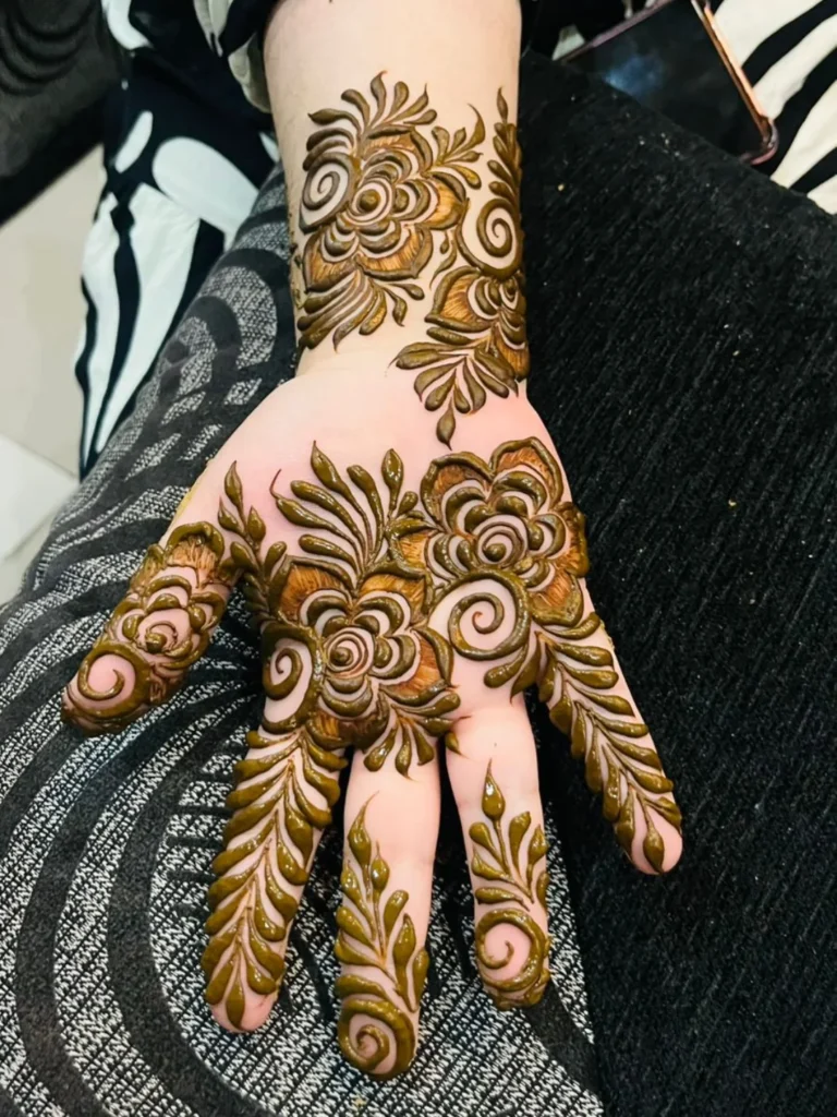 Unlike intricate styles, this pattern focuses on dramatic boldness and artistic flow. Ideal for festive occasions, this design offers a confident and modern look while staying rooted in traditional henna artistry.