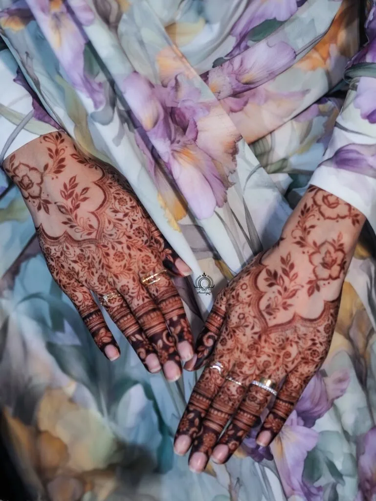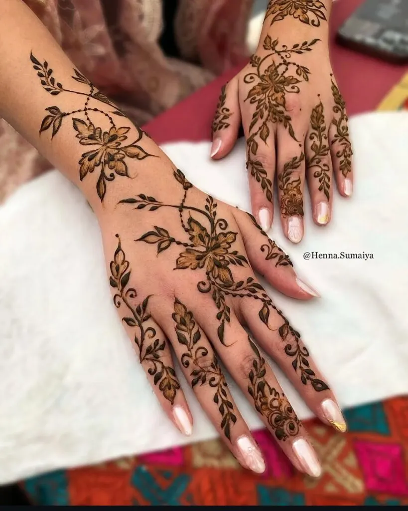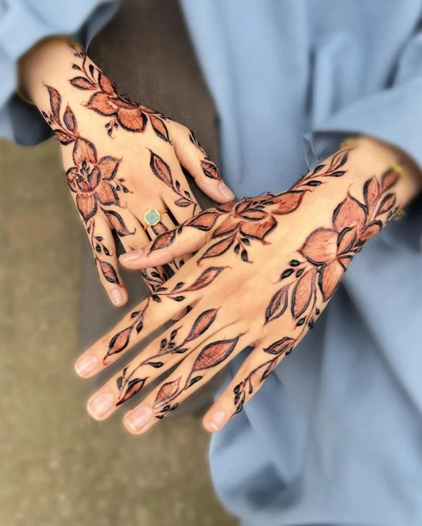 This henna tattoo features flowing floral vines that extend gracefully across both hands, emphasizing natural beauty and elegance.