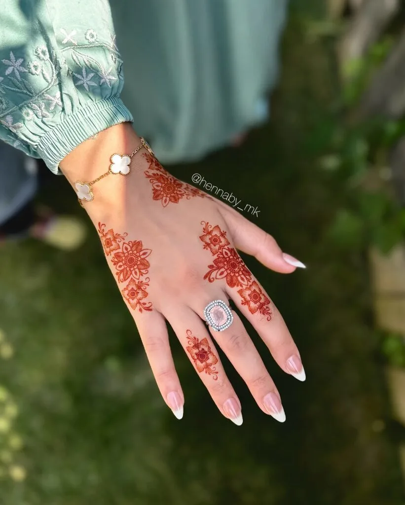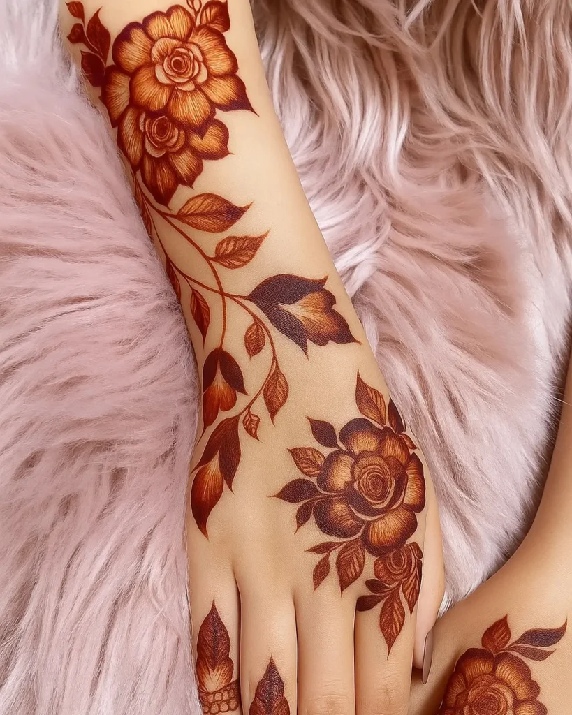 This design beautifully places bold floral motifs across the back of the hand, arranged in a scattered yet elegant style.