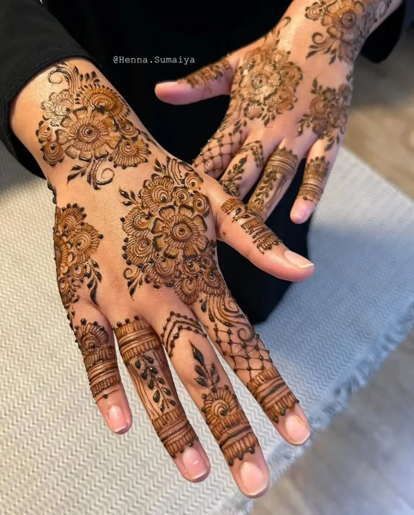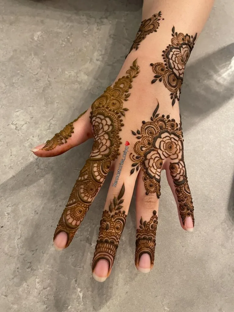 The thickness of the henna lines enhances the boldness, making the flowers stand out prominently. Perfect for festive occasions, this style embraces a dramatic yet elegant look, showcasing tradition in a vibrant and expressive way.