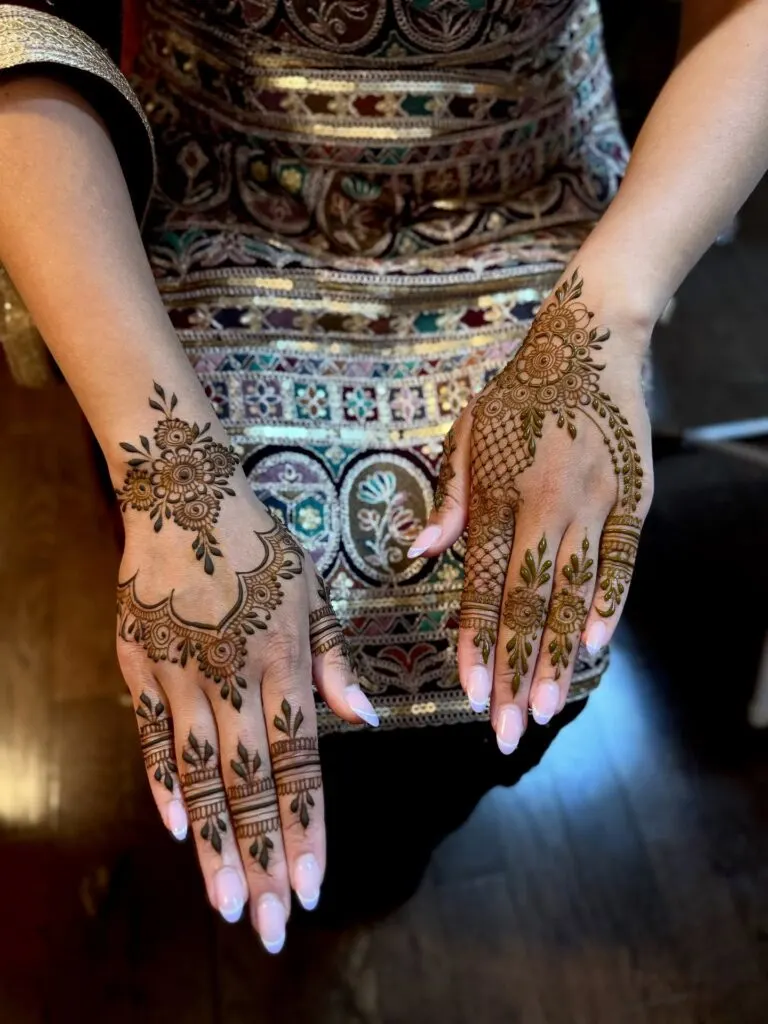 Its balance of dense florals and delicate fillers makes it perfect for weddings, festive occasions, or formal events. With its rich detailing and graceful structure, this henna style captures both traditional charm and modern sophistication.