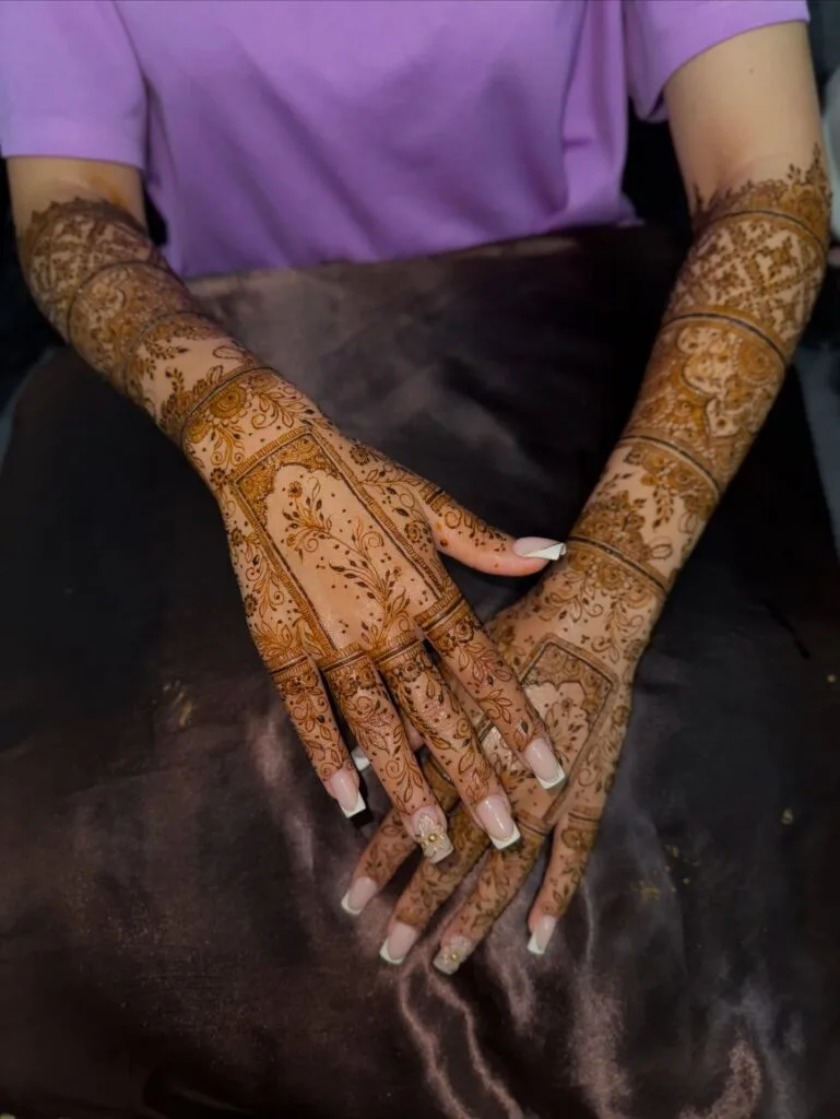The fingers are adorned with fine mesh patterns, leafy vines, and geometric lines, giving a perfectly balanced look. Extending to the wrists, the design features layered arches and ornamental motifs that resemble traditional jewelry.