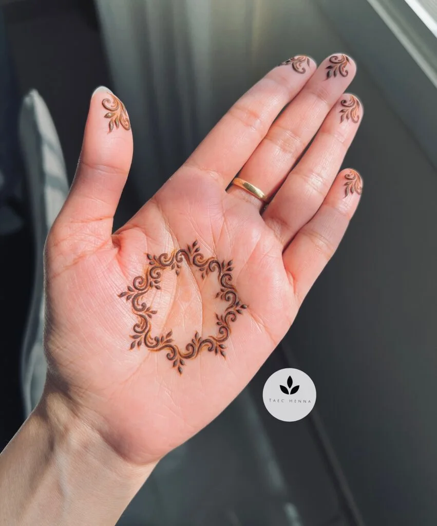 The open space within the frame gives the design a clean and airy feel, emphasizing elegance over density. Each fingertip is adorned with matching small motifs, enhancing consistency while keeping the overall style light.
